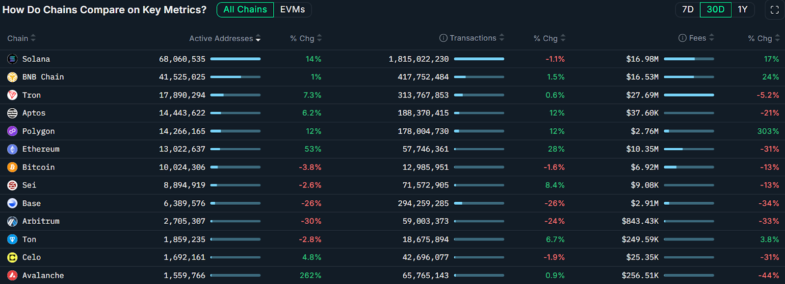 Лідерство Solana серед мереж можна пояснити її активністю, оскільки Solana була найбільш використовуваною мережею, маючи понад 68 мільйонів активних адрес протягом останніх 30 днів, що на 14% більше, згідно з даними платформи крипторозвідки Nansen.