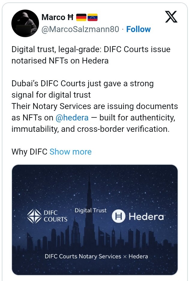 Ось як виглядає справжнє впровадження. Не галас, а інфраструктура: регульоване середовище, юридичні процеси та перевірені рейки довіри, що переходять у цифровий формат. Якщо більше судів/нотаріальних систем наслідуватимуть цю модель, ми розглянемо масштабований план цифрової ідентифікації та цілісності документів на базі Hedera.