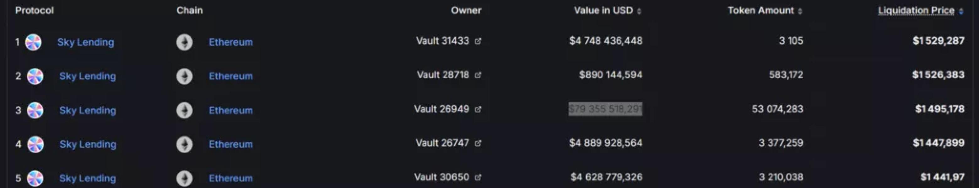 Як повідомляє DeFi Llama, у Sky є користувач, який займає позицію вартістю 79,4 мільйона доларів, яку можна примусово ліквідувати, якщо оракули встановлять ціну Ethereum нижче 1495 доларів.